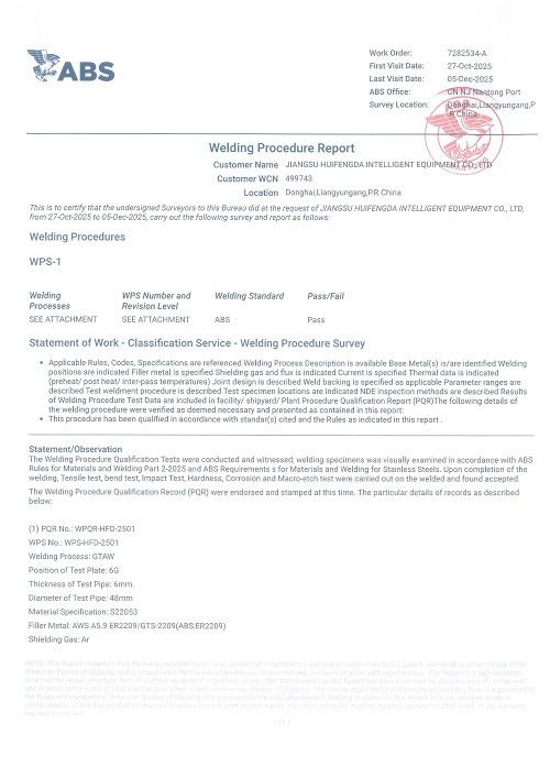近日,江苏慧峰达在船舶设备制造领域取得一项重要技术资质进展,其船舶管道、脱硫塔等关键设备生产所涉及的焊接工艺规程及相关焊工技术水平,已正式通过美国船级社的严格评审,获得ABS(American Bureau of Shipping)颁发的相应认证证书。